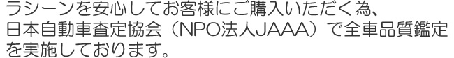 鑑定のポイント1 第三者機関による鑑定 クルマの鑑定を行う第三者機関は、NPO法人 日本自動車鑑定協会。第三者の立場から、消費者の中古車に対する不安を取り除き、満足を提供していくための活動を行っている団体です。 <主な活動内容> ・消費者に向けた中古車の情報開示 ・販売店に向けた品質鑑定の請負 ・業界に向けた査定義務の確立と浸透 ・査定に関する情報提供